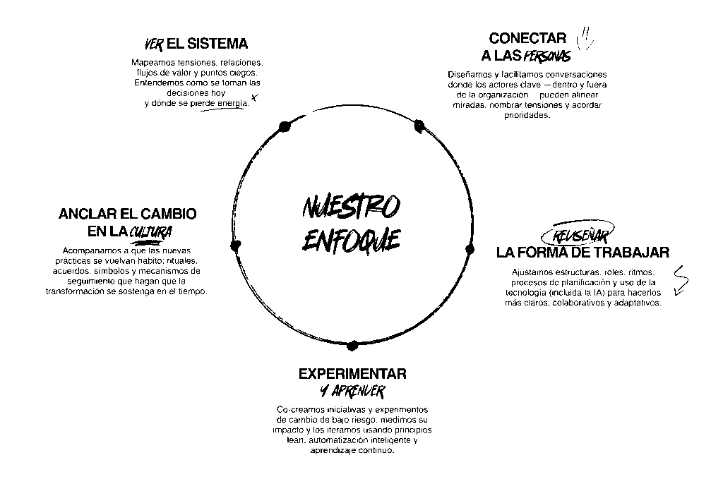 Integramos evolución cultural, diseño organizacional, principios lean y uso responsable de IA para generar cambios que se sostienen en el sistema, no solo en un área.